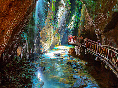 張家界朝陽地縫景區(qū)地處慈利縣朝陽境內(nèi),全長5公里,垂直深度近200米。朝陽地縫為趙家埡庫區(qū)流水經(jīng)幾億年沖刷而形成的100多米深的崖縫,兩崖最窄處僅一米多寬,景色集奇、秀、險、野、幽于一體。景區(qū)內(nèi)溪水清澈,空氣清新,冬暖夏涼,四季如春,是旅游觀光、避暑休閑、考察探險的好去處。